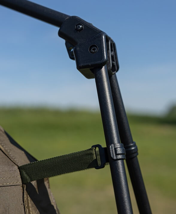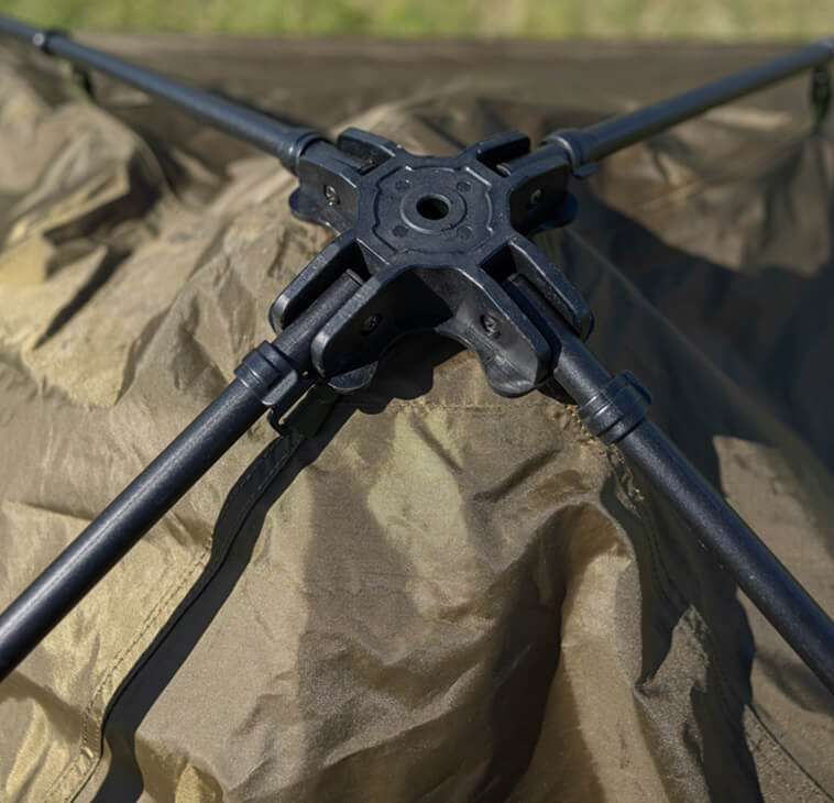 Konštrukcia je tvorená teleskopickými hliníkovými tyčami 19 mm, ktoré umožňujú rýchle a jednoduché zostavenie aj jednou osobou a zároveň znižujú objem pri transporte. Dvojito zosilnené pätky so stabilizačnými kotviacimi šnúrami zaisťujú stabilitu aj pri silnom vetre či nepriaznivom počasí.