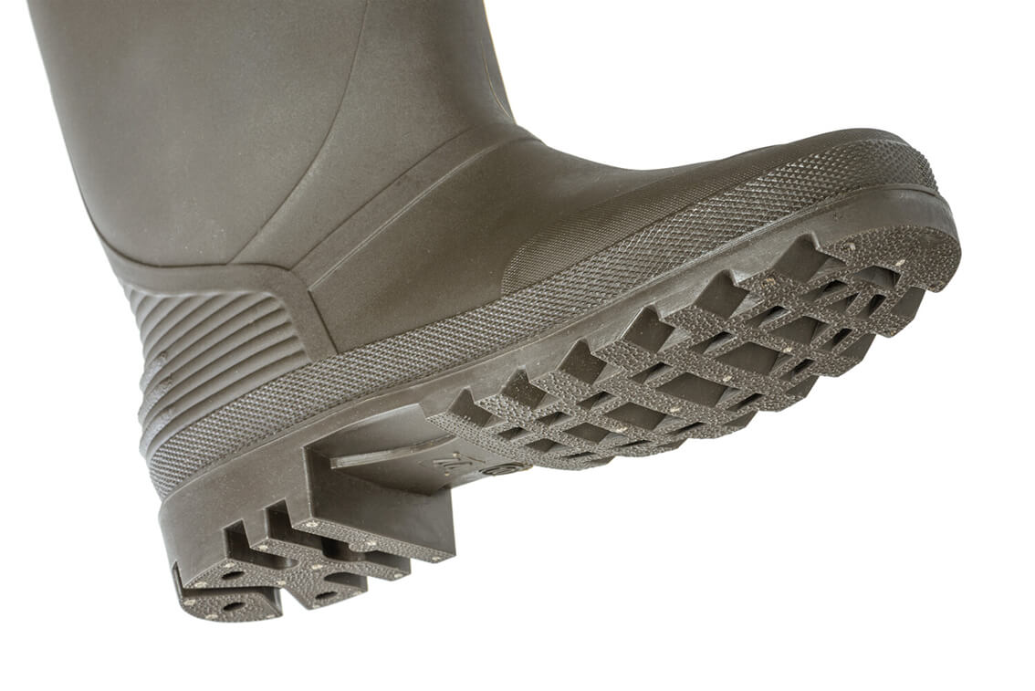 Robustné integrované topánky sú vybavené protišmykovou podrážkou a špeciálne tvarovanou pätou s hlbokými výstupkami, ktoré umožňujú jednoduché a rýchle vyzúvanie. Všetky švy sú precízne zatavené, čo zaručuje 100 % vodotesnosť. Zosilnené partie v oblasti kolien poskytujú zvýšenú ochranu bez použitia objemných vonkajších záplat, ktoré by sa mohli časom uvoľniť.