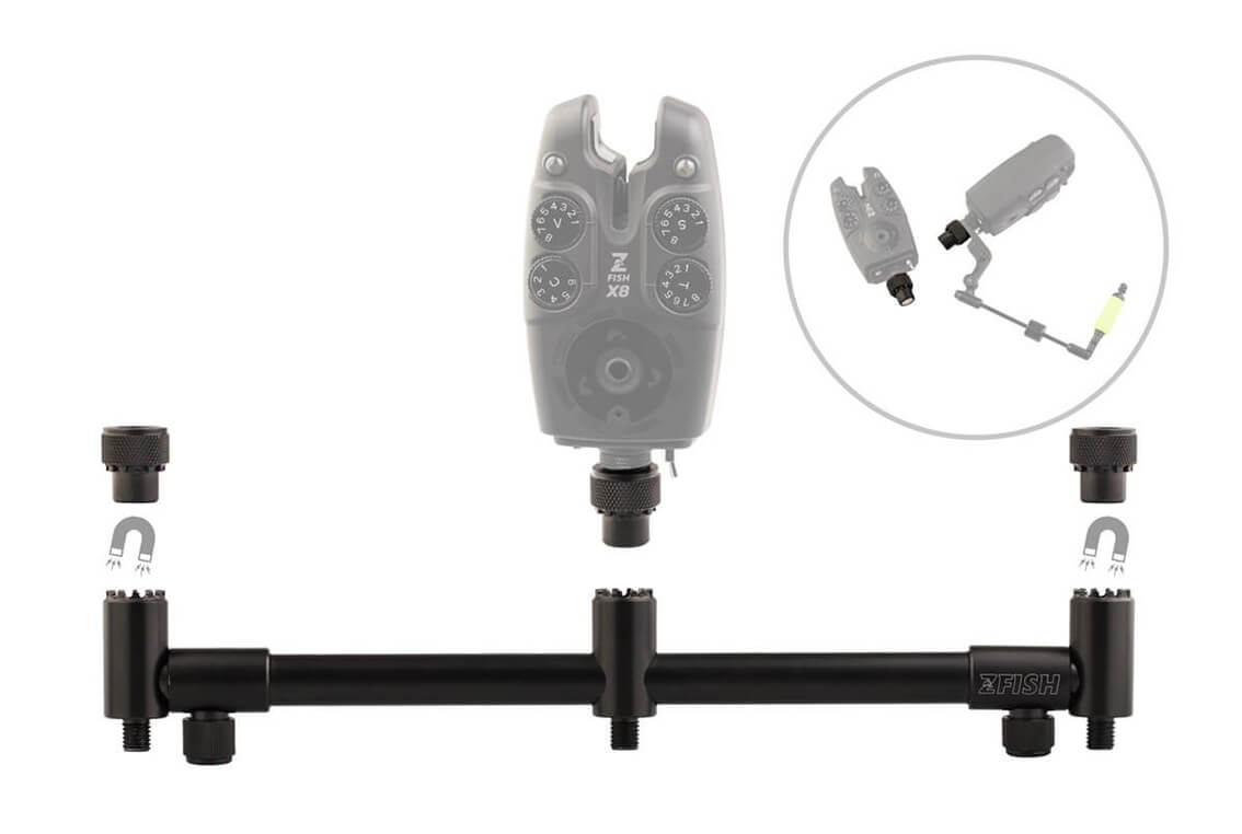 ZFISH Magsafe Buzzer Bar na 3 pruty je velmi precizně zpracovaná, kvalitní a pevná hliníková hrazda v černém matném provedení. Velkou výhodou jsou integrované magnetické adaptéry/rychlospojky pro hlásiče, které výrazně usnadňují jejich montáž a demontáž.