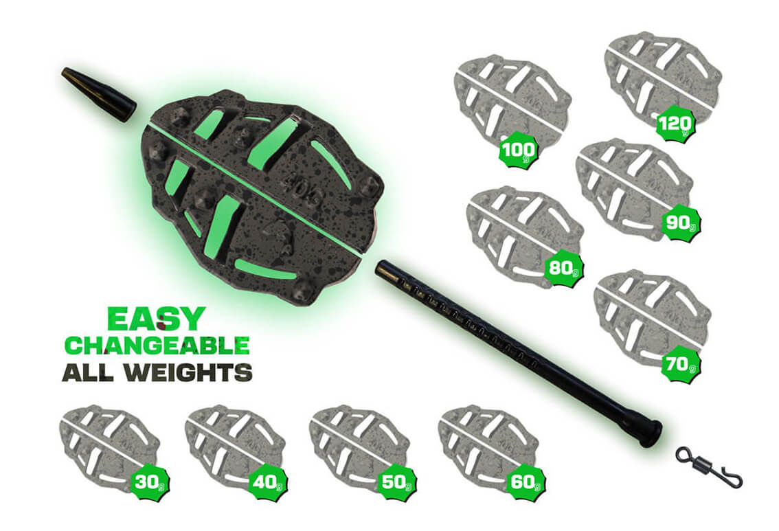 Krmítka Spider umožňujú rýchlu výmenu záťaže vďaka vyberateľnej trubičke a otvoru na zadnej strane - stačí vysunúť trubičku, uvoľniť vlasec a vymeniť záťaž za inú bez nutnosti preväzovania celej zostavy. Krmítka sú vyrobené z bezolovnatého materiálu v matne zelenej farbe s čiernymi bodkami, ktoré dokonale splynú s dnom a minimalizujú plašenie rýb.
