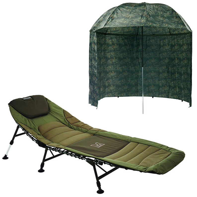 Prevratný set lehátka a jediného 100% nepremokavého dáždnika PVC za vynikajúcu cenu. Šesťnohé lehátko s veľmi ľahkou a extrémne stabilnou konštrukciou. Silné teleskopické nohy s pevnou aretáciou umožňujú zdvihnutie lehátka vysoko nad zem, čo je výborné pre pohodlné sedenie a vstávanie. Anatomicky tvarovaný matrac so silným polstrovaním je zárukou vysokého pohodlia a výbornej tepelnej izolácie i počas chladnejších nocí.Jedine teraz ponúkame v sete so 100% nepremokavým dáždnikom PVC (zelená alebo kamufláž verzia) s bočnicami, ktorý je vybavený silno stennou tyčou, odolnou voči deformácii. Poťah je vyrobený z ľahkého, avšak 100% nepriepustného "pogumovaného" materiálu v zaujímavej maskáčovej úprave s lepenými švami, ktoré zabraňujú akémukoľvek preniknutiu kvapiek vody do vnútra.