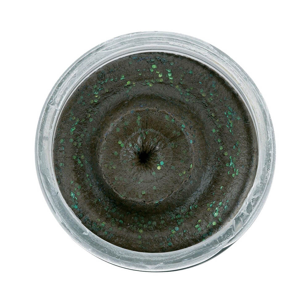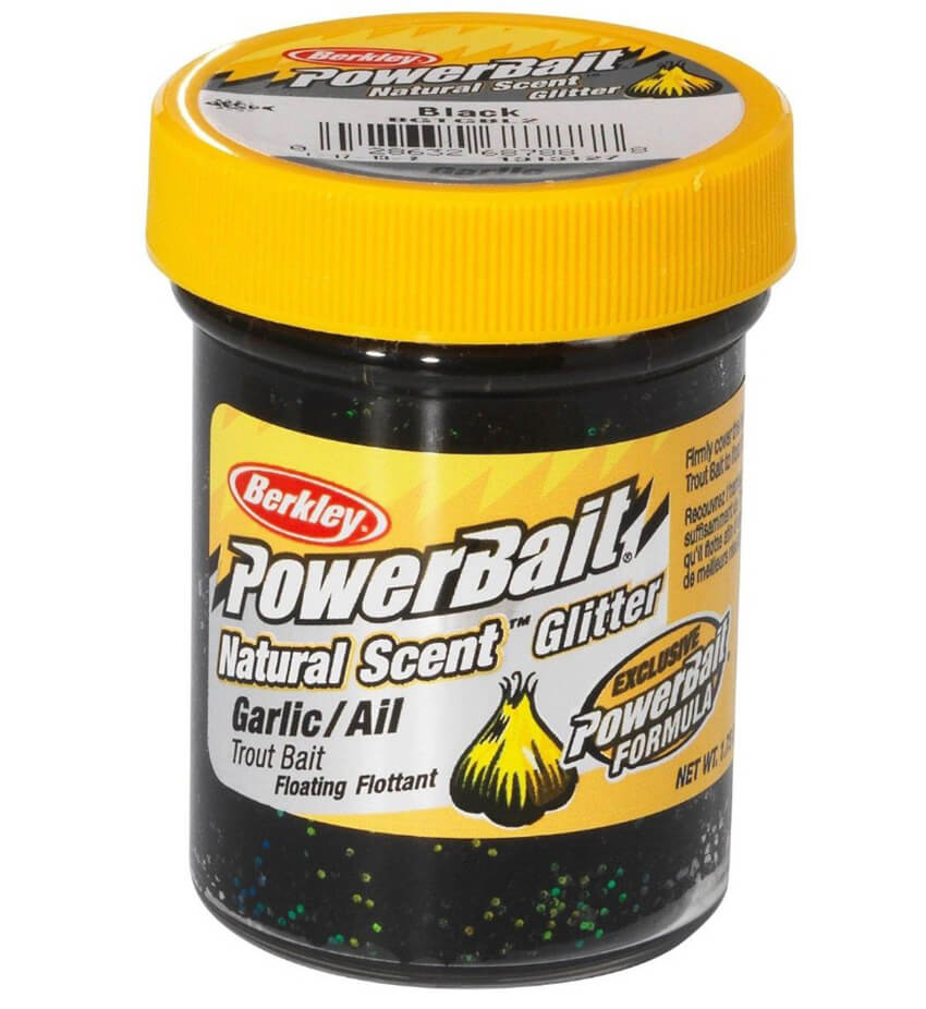 Těsto BERKLEY PowerBait Natural Glitter Trout Dough Black Gliter, Garlic, popis